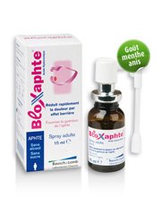 Aphte, aphtes. BloXaphte spray adulte réduit rapidement la douleur par effet barrière. Favorise la guérison de laphte. Ne pique pas.